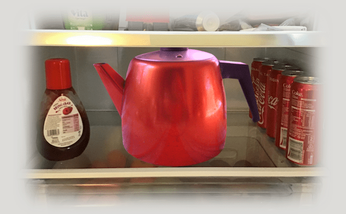 Jeg hadde det. Den var rød, den var velbrukt, og den ble min siste av det slaget. Fordi det er mulig at det som skjedde var årsaken til at jeg ikke så alt for lenge etter byttet den ut med min første kaffetrakter. Den var litt verre å plassere i kjøleskapet uten å registrere det der og da. Min datter var 10-12 år gammel da dette skjedde. På en vårlig søndag i slutten av april 2021 kom jeg på hendelsen, og fikk idéen til å finne ut hvorfor kaffekjelen havnet i kjøleskapet for rundt to og et halvt ti-år siden. Og ikke i skapet ved siden av, der den vanligvis sto.