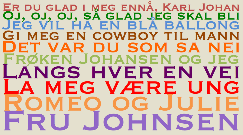 Jeg har finstudert VG-lista, den offisielle salgslista i Norge, for å finne hvilke norskspråklige låter som toppet lista i perioden 1960-1969. Og fant at i løpet av ti år var ti låter med norsk tekst Norges mest solgte i til sammen 41 uker. Trenger jeg ta med at ti år består av 520 uker? Låtene kom for øvrig fra seks jenter, én gutt og ett band, og fem av dem var utenlandske låter oversatt til norsk.
