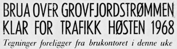 I juli var veien fra Myklevoll gjennom tunnellen i Balteskard og videre mot Renså åpnet for nødvendig trafikk, skrev Harstad Tidende. Selv om det ikke var lagt toppdekke hele veien, var den allerede populær blant folk fra andre sida av kommunen, for en søndagstur med nye opplevelser. På eget ansvar, antar jeg. Onsdag 12. juli 1967 kunne man lese i samme avis at tegningene for underbyggingen av brua over Straumen i Grov var klare. Og at de ville bli sendt Veisjefen i Troms i løpet av uka.