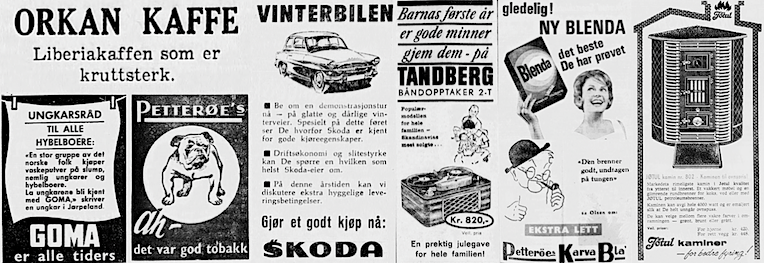 Jeg tar også med noen annonser fra ukeblader i årene rundt 1960. Legg merke til reklamespråket, og sammenlign det med dagens.