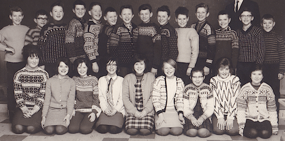 Når jeg ser på bilder fra før i tida, i gamle dager, blir jeg påminnet om at vi unger vokste opp i hjemmesydde klær og hjemmestrikkede gensere og kofter. Bare se på bildet under av klassen min, knipset i 1964 på skolen i hjembygda. Hjemmestrikket og hjemmesydd hele veien. Så får du forestille deg hvor fargerik klassen var. Jeg har forresten sensurert bort læreren. Fordi han hadde på seg dress, hvit skjorte og slips, og passet ikke helt inn i moten vår den dagen.