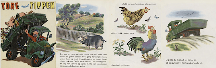Brunost kostet for øvrig bortimot 10 kroner kiloet i 1962. I dagens verdi nesten én og en halv hundrelapp. Tegneserieblader kostet rundt ei krone, mens ukeblader kostet bortimot to kroner. Og i begge deler var det farger i fleng. Farger var det også i den aller første boka jeg fikk som barn. Den du ser litt fra på bildet under. Foreldrene min kjøpte boka «Tore med tippen» til meg på 50-tallet, helt sikkert fordi den handlet om en som het det samme som meg. Og fordi han var en snill kar, akkurat som meg.