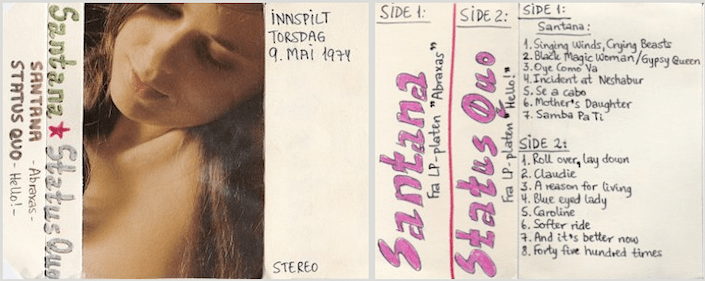 Torsdag 9. mai 1974, etter arbeidstid, tok jeg opp Santana sitt andre album «Abraxas» på side én og Status Quo sitt sjette album «Hello» på side to på en C60-kassett i platebaren i radio-/TV-forretninga der jeg jobbet. Jeg pleide å gjøre det sånn, fordi jeg hadde muligheten til det. Santana sitt album ble mitt første med bandet. Det samme ble Status Quo sitt. Kassetten ble plassert i det lille stativet på hybelen blant andre S-kassetter. Selvsagt.