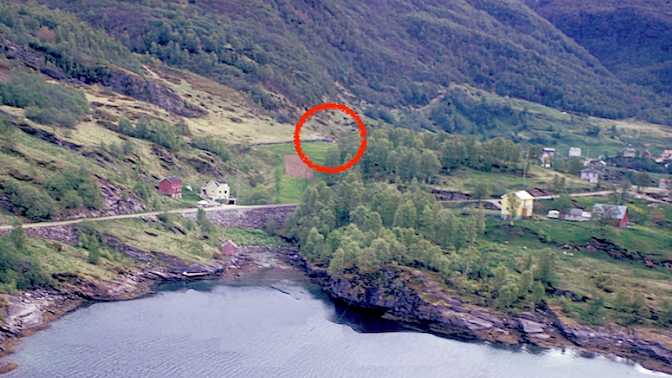Basen fant vi fort. Løsningen ble det røde sommerfjøset innafor steingjerdet langt der oppe i ytterkanten av Jupviksletta, på Halsen. Det sto der, ulåst og ubrukt på sommertid, og passet oss perfekt. Du ser det inni den røde ringen på bildet fra digitaltmuseum.no. Bildet er ti år nyere enn hendelsene i denne historia, og skogen til høyre er litt tettere enn den var tidlig på 60-tallet.