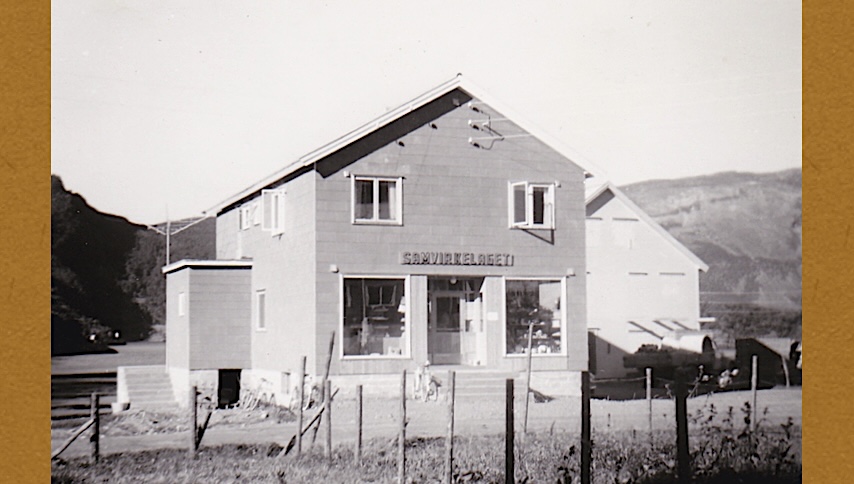 På Moa i Grov ble bygdas nye samvirkelag tatt i bruk og åpnet denne høsten. Du ser det på bildet over, knipset av min pappa. Han hadde vært bestyrer i Astafjord Samvirkelag siden høsten 1955. Butikken lå fra starten i det nederste bygget til høyre for dagens Matkroken-butikk på Sjøvollen. Vi flyttet etter hvert inn i leiligheten over nybutikken, til det som for oss unger skulle bli en fin barndom på Moa. Mitt rom – som jeg en periode måtte dele med lillesøstera mi – lå bak vinduet til venstre over butikkvinduene.