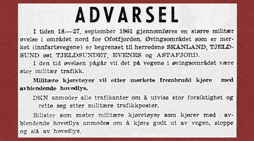 Lekekrigen skulle i gang i Sør-Troms i siste halvdel av september. Lekekrig for de voksne, men alvorlig nok for oss unger. Og spesielt for de britiske og norske militære styrkene som var involvert i øvelsen «Peter Pan» rundt omkring i området. Og ikke minst for eierne av terrenget. I avisannonsen under gikk arrangøren ut i begge lokalavisene med en advarsel om at alvoret skulle i gang i vår kommune og kommunene rundt oss.